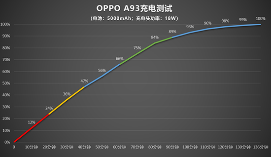 這一次的OPPO A93在5000mAh大電池超長續(xù)航的基礎(chǔ)上,同時也帶來了18W疾速閃充功能。這款手機的18W疾速閃充能夠在十分鐘充電12%,半小時充電30%,一小時充電60%,全程125分鐘左右就可以完全充滿。根據(jù)充電曲線圖來看,在充電過程中幾乎全程速度保持穩(wěn)定,只有在90%電量之后為了延長電池壽命、保護電池健康,速率才有所下降。125分鐘充滿整塊5000mAh大電池,這個充電速度在同價位產(chǎn)品中實力很強勁。