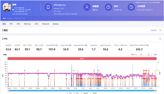 理論跑分是一個(gè)參考,實(shí)際的使用場(chǎng)景更具備考察意義。在Motorola edge s上,我們運(yùn)行時(shí)下最熱的手機(jī)性能壓榨游戲《原神》,畫(huà)面設(shè)置上調(diào)整為最高畫(huà)質(zhì),進(jìn)行30分鐘的游戲測(cè)試,用性能狗軟件采集數(shù)據(jù),得出的結(jié)論也十分有趣。