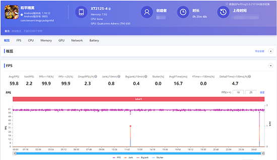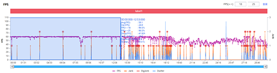 在幀率的穩(wěn)定性上,在30分鐘的游戲測(cè)試中Motorola edge s跑出了53.6幀的平均幀率。從幀率曲線(xiàn)中可以看出,在游戲的前13分鐘左右,用無(wú)論用戶(hù)操作如何風(fēng)騷飄逸,打斗場(chǎng)面和技能釋放如何華麗,Motorola edge s幾乎都能維持在59fps的流暢畫(huà)面。