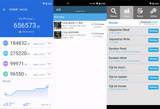 首第一組理論性能測試,常溫環(huán)境安兔兔跑分65W+。GFXBench曼哈頓離屏ES3.1 99fps,ES3.0 141fps,略高于驍龍865。
