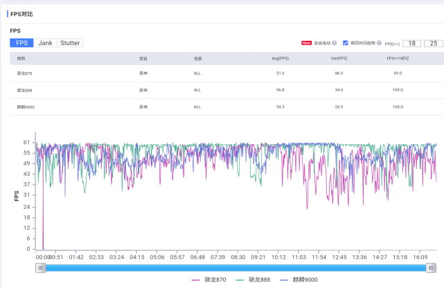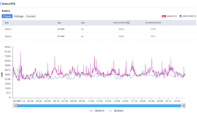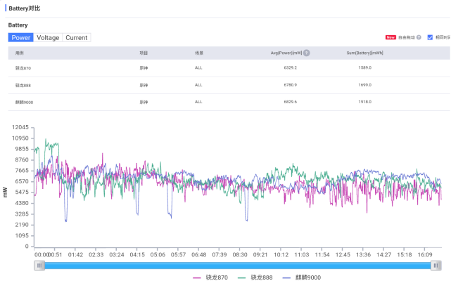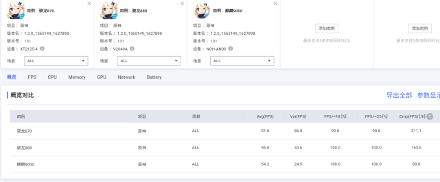 對比今年的旗艦芯驍龍888和麒麟9000,驍龍870和平精英幀數(shù)表現(xiàn)沒差距,但平均功耗是當中最高的,達到了4.2W。原神性能波動比較明顯,特別是后期發(fā)熱后。幀數(shù)稍差一些,平均功耗是當中最低的,6.3W。