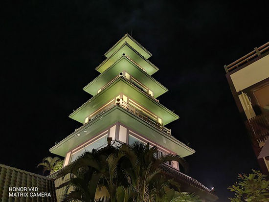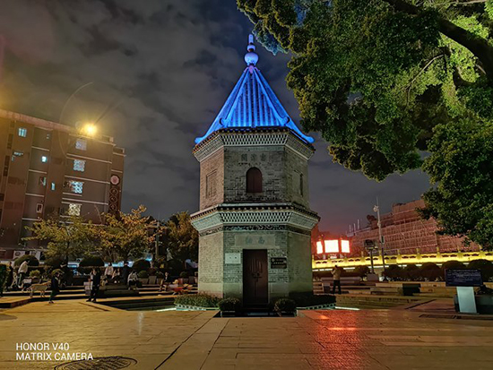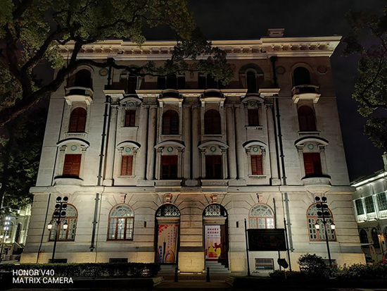夜景拍攝并不是追求光如白晝的效果,而是要光暗分明,帶出“夜”這個主題??梢钥吹綐s耀V40采用夜景模式拍攝建筑物擁有非常好的效果,首先突出建筑物的主體,打在建筑物上的燈光控制得恰到好處,沒有出現(xiàn)過曝,另外對于背景的天空也是非常干凈,沒有過多的噪點,讓整個夜景照片變得非常通透。