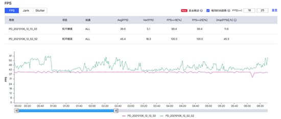 從PerfDog監(jiān)測曲線中可以看出,解鎖高畫質(zhì)后,realme真我V15平均幀率來到45幀(最高來到60幀,但并不穩(wěn)定)。