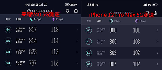 實測體驗方面,筆者使用榮耀V40在公司附近一處覆蓋很好的開闊地帶進(jìn)行體驗,可以看到與蘋果的iPhone 12 Pro Max擊鼓相當(dāng),完全不落下風(fēng)。在各測試5次數(shù)據(jù)后,榮耀V40的峰值速率有一定優(yōu)勢,峰值速率超過820Mbps。而穩(wěn)定性方面,還是蘋果iPhone 12 Pro Max做得更好。