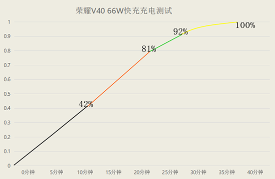 至于說快充表現(xiàn),這里也就測試了榮耀V40的66W有線快充,官方數(shù)據(jù)是充滿約35分鐘,在實(shí)際的充電測試中,從0%的電量開始充到最后電量充滿,整個(gè)過程約花費(fèi)了37分鐘時(shí)間,與官方數(shù)據(jù)并無太大差距。如此超快的充電速度能夠讓碎片化充電變得更有實(shí)際意義,并減輕用戶續(xù)航焦慮煩惱。