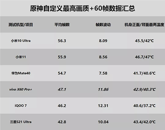 《原神》中,vivo X60 Pro+幀數(shù)表現(xiàn)還是和iQOO 7接近,正背面的溫度卻更高,整體體驗(yàn)可能差于iQOO 7。