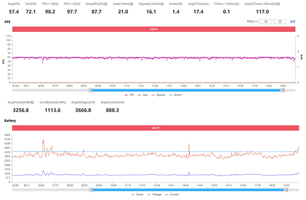 《和平精英》幀率也可以達到60FPS,游戲期間的功耗略高一些,接近3800mW左右,不過實際感知并不強,在冬季15℃左右的室內(nèi),一局30分鐘游戲之后,手機只不過有微熱感,耗電也在10%左右。