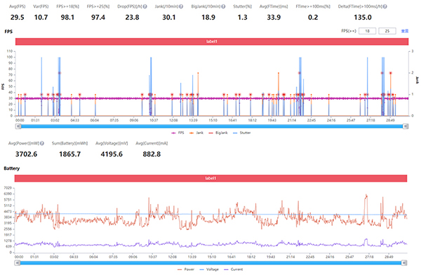 《原神》是目前的話題游戲,對手機性能也有較高的要求,默認設(shè)置時,可以比較輕松地跑滿30FPS,功耗只有3700mW,正常游戲半小時,耗電約11%。