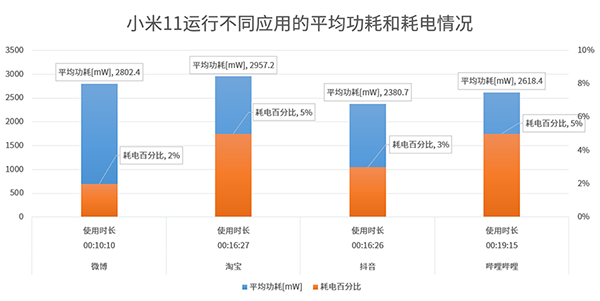 應(yīng)用方面,由于小米11擁有自適應(yīng)刷新率功能,因此使用微博、淘寶、抖音和嗶哩嗶哩時,根據(jù)顯示內(nèi)容不同,幀率會出現(xiàn)大幅變化,一般只有在播放視頻或連續(xù)滑動頁面時才會達到最大幀率,能夠兼顧流暢性和功耗。至于運行不同應(yīng)用時的功耗、耗電情況,大家可以參考下方的圖表。