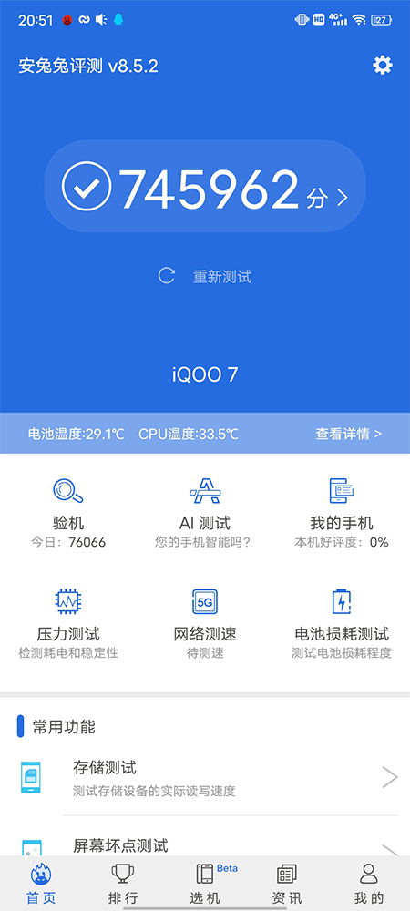 首先是安兔兔跑分測試,如下圖所見,iQOO 7取得了745962分,這個成績可以說相當(dāng)不錯,也說明該機(jī)充分發(fā)揮出了驍龍888的性能優(yōu)勢。這里需要強(qiáng)調(diào)的是,在強(qiáng)悍性能的基礎(chǔ)上,該機(jī)還搭載了增強(qiáng)版LPDDR5、增強(qiáng)版UFS 3.1,這兩項配置在順序讀取速度和隨機(jī)寫入速度方面有明顯的提升,進(jìn)一步增強(qiáng)了該機(jī)的綜合實力。