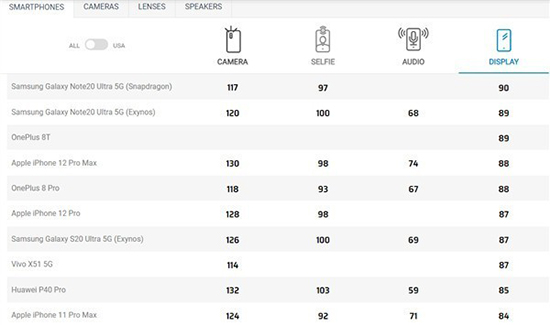 根據(jù)DXOMARK的排行榜,三星Galaxy Note20 Ultra 5G (驍龍)屏幕評(píng)分90分,排名第一。三星Galaxy Note20 Ultra 5G (Exynos) 和一加8T并列第二。