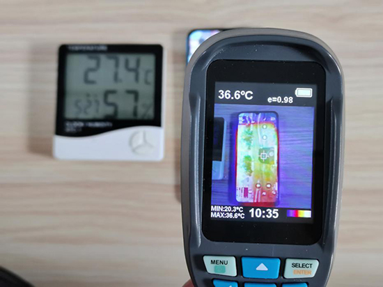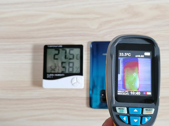 測(cè)試方法:在Redmi 10X電量充足的前提下,用Wi-Fi網(wǎng)絡(luò)玩一個(gè)小時(shí)的《和平精英》,游戲幀率選擇60幀模式,游戲過(guò)程中每隔5——8分鐘用熱敏溫槍測(cè)一次手機(jī)的正面、背面溫度,測(cè)試的房間溫度約27℃,恒溫。