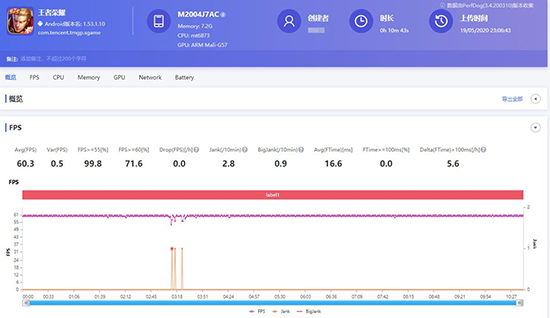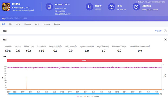 通過(guò)測(cè)試,可知Redmi 10X在玩《王者榮耀》的時(shí)候,總體上也是近滿幀運(yùn)行,只有在約3分20秒的時(shí)候有一小股騷動(dòng),但起伏都在5幀之內(nèi),如果不是查看幀率曲線都不會(huì)發(fā)現(xiàn),因?yàn)楣P者在游戲中沒(méi)有任何感覺(jué)。幀率方差極小,只有0.5,這意味著大部分時(shí)間段加載的畫(huà)幅是相同的,用戶在體驗(yàn)上當(dāng)然就感覺(jué)不到卡頓。