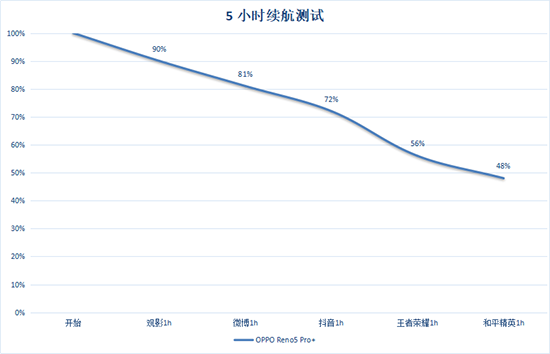 從測(cè)試結(jié)果來看,放1小時(shí)1080P視頻后耗電10%,刷1小時(shí)微博耗電9%,1小時(shí)抖音耗電9%,這樣的耗電水平算是中規(guī)中矩,1小時(shí)《王者榮耀》耗電16%,1小時(shí)《和平精英》耗電18%,整體功耗控制穩(wěn)定。5個(gè)小時(shí)后,OPPO Reno5 Pro+電量剩余48%。這樣看來,在4500mAh電池還是能夠滿足用戶的一天的使用需求,若是配合智能分辨率、智能刷新率等各項(xiàng)優(yōu)化的話,續(xù)航體驗(yàn)會(huì)更加友好。