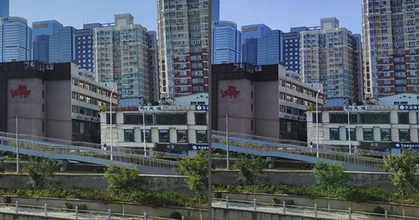 先來看白天主攝畫質(zhì)對比,X50 Pro+主攝GN1默認(rèn)1250萬像素,開啟高像素模式支持5000萬像素、1億像素,而X50 Pro主攝IMX598默認(rèn)1200萬像素,開啟高像素模式可達(dá)4800萬像素,以下筆者使用兩款手機拍攝遠(yuǎn)處的建筑群。