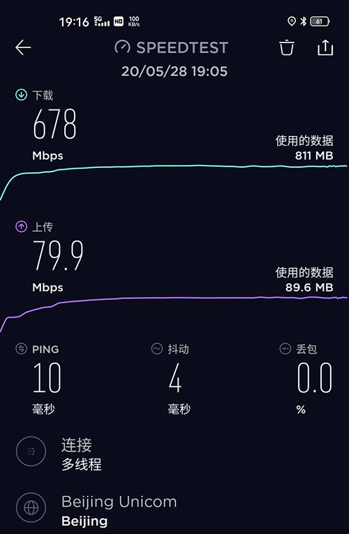 Speedtest實測,vivo X50 Pro的5G的下載速率為678Mbps,上傳速率達到了79.9Mbps,這個成績符合聯(lián)通5G套餐的網(wǎng)速。