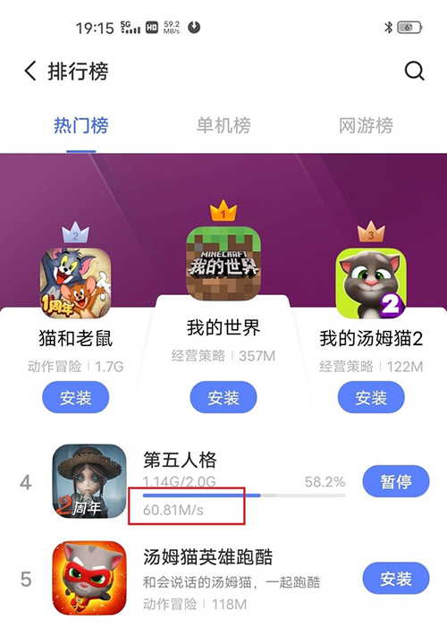 5G網(wǎng)絡環(huán)境下,vivo X50 Pro軟件下載速度表現(xiàn)也是極為優(yōu)秀的,穩(wěn)定在60.81MB/s上下,游戲下載速度較4G有大幅度提升。當然,這個速度尚未達到最高值。若是5G網(wǎng)絡環(huán)境足夠好,手機下載速度甚至能夠達到100MB/s以上。