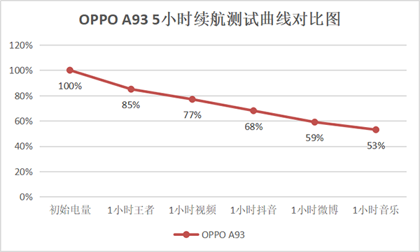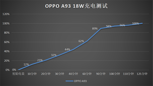 從整個充電測試的曲線圖來看,我們不難發(fā)現(xiàn),配備了18W有線快充的OPPO A93從0到100%總共耗時110分鐘,這樣的充電時間相信能夠讓絕大多數(shù)人滿意。尤其是0-90%這一段的充電速度還是非??斓模绻敝鲩T也不必等到充滿。5000mAh的大容量電池,就算充至90%,也能夠滿足一天的電量需求。