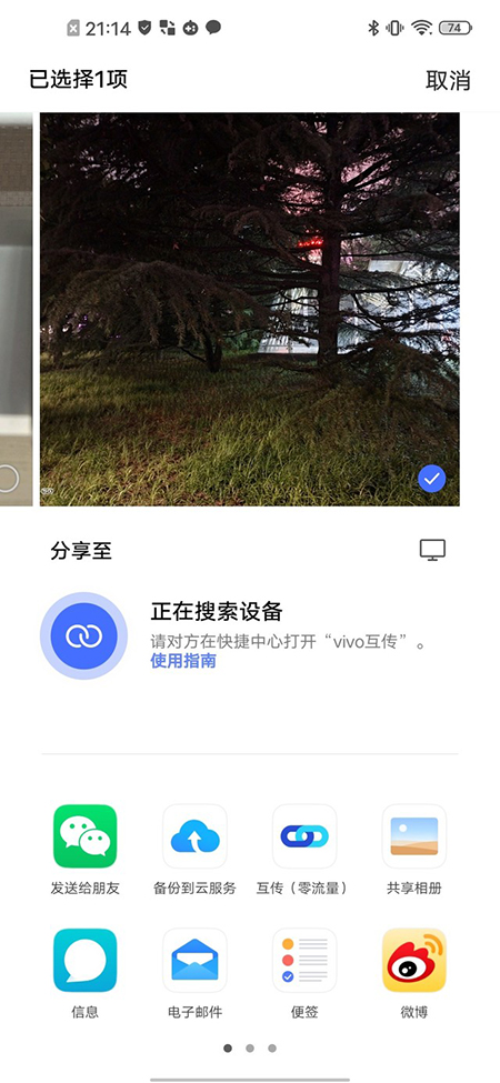 在實(shí)際體驗(yàn)中,vivo Y70s可以直接發(fā)現(xiàn)附近打開(kāi)了互傳功能的手機(jī),從而免去了進(jìn)行配對(duì)的繁瑣操作,直接將文件傳輸給支持互傳的機(jī)型。