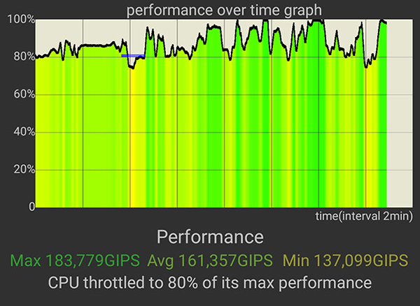 隨后,我們使用CPU Throttling Test進(jìn)行了CPU拷機(jī),看一看OPPO A92s的極限算力表現(xiàn)。在15分鐘的測(cè)試過(guò)程中,天璣800 5G芯片的CPU可以發(fā)揮出至少80%的算力,并沖到了最高的2.0GHz主頻。