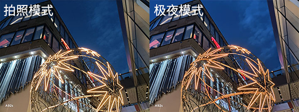 OPPO A92s還可在暗光條件下自動(dòng)開啟極夜模式,通過(guò)算法優(yōu)化,輸出明亮、清晰、純凈的夜景圖像,實(shí)際對(duì)比一下表現(xiàn)還是很優(yōu)秀的。更良心的是,極夜模式與常規(guī)拍照模式一樣,能夠支持從廣角到10倍的變焦選項(xiàng)。