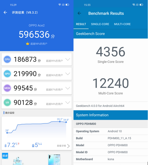 從跑分來看,OPPO Ace2安兔兔可以達(dá)到驚人的596536分,Geekbench單核為4356分,多核為12240分,絕對是旗艦機(jī)的水平。