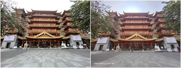 再看看這兩款機(jī)型都具備了超廣角鏡頭,對(duì)于廣角的拍攝是出門(mén)旅行的小伙伴最為常用的功能之一。OPPO Reno5 Pro+與iPhone 12的超廣角拍攝都擁有理想的效果,兩款機(jī)型拍攝的樣張成像都十分清晰,畫(huà)面邊緣也沒(méi)有產(chǎn)生明顯的畸變,古建筑仍然是筆直挺拔,但iPhone 12丟失了天空的部分細(xì)節(jié),而OPPO Reno5 Pro+則是更好的呈現(xiàn)出來(lái)。