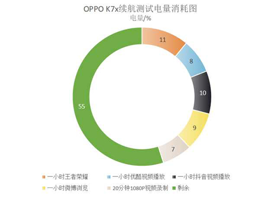 對(duì)于像我這樣的手機(jī)深度用戶(hù),出門(mén)玩耍最怕就是沒(méi)電,而OPPOK7x的超強(qiáng)續(xù)航正好解決了這方面的擔(dān)憂。在實(shí)際耗電測(cè)試中,我們?cè)谑謾C(jī)滿電的情況下開(kāi)始測(cè)試,連續(xù)進(jìn)行1小時(shí)王者榮耀、1小時(shí)在線視頻播放、1小時(shí)抖音視頻播放、1小時(shí)微博信息瀏覽及20分鐘1080P視頻錄制,在經(jīng)過(guò)五輪暴力耗電后,OPPO K7x還有55%的剩余電量,續(xù)航能力令人眼前一亮,對(duì)于日常生活使用更是可以輕松應(yīng)對(duì)。