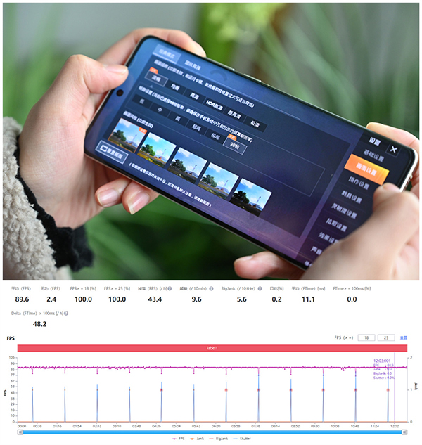 全民娛樂的《王者榮耀》與《和平精英》體驗下來十分流暢,全程可做到滿幀運(yùn)行。而且120Hz的高刷也讓vivo X60 Pro+在《和平精英》中開啟流暢畫質(zhì),以90幀率進(jìn)行游戲體驗,240Hz觸控采樣率也帶來了跟手性更快速的擊打體驗,實(shí)測平均FPS 89.6,趨向直線的FPS數(shù)值線走勢側(cè)面也體現(xiàn)了vivo X60 Pro+的性能強(qiáng)悍。