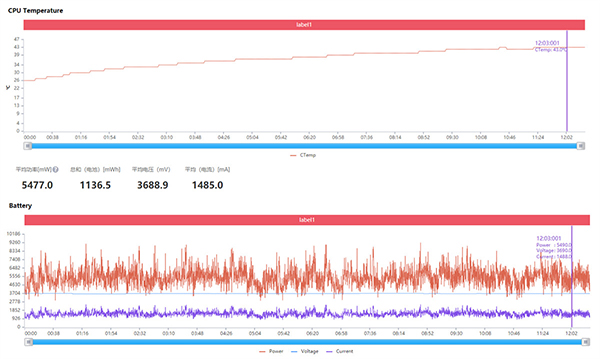 游戲體驗后,CPU的溫度從起初的26℃上升到43℃,機(jī)身溫度控制還算不錯,雖然握持時有溫?zé)岣?,但是在可接受范圍?nèi),無法承擔(dān)冬天暖手寶的作用。游戲的平均功率為5477mW,功耗尚可。