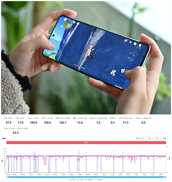在對手機(jī)配置要求更高的《原神》游戲測試中,vivo X60 Pro+也發(fā)揮了十分不錯的表現(xiàn),將游戲畫質(zhì)均調(diào)整至最高狀態(tài)情況下,游戲平均FPS為57.9,F(xiàn)PS數(shù)值走勢線雖然有波動,但是浮動較少,游戲?qū)嶋H體驗也比較順暢。