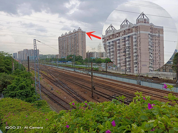 上面的樣張是拍攝于雨后的傍晚,光線條件還是比較不錯的,不會過亮或太暗。從實際的樣張中可以看到,在4800萬像素模式下,iQOO Z1的表現(xiàn)還是非常穩(wěn)的,細(xì)節(jié)呈現(xiàn)豐富,遠(yuǎn)處的高樓在放大數(shù)倍后樓層窗戶等細(xì)節(jié)依然清晰可見,整體沒有太明顯的涂抹痕跡,可見天璣1000 Plus的ISP處理能力還是比較出色的。