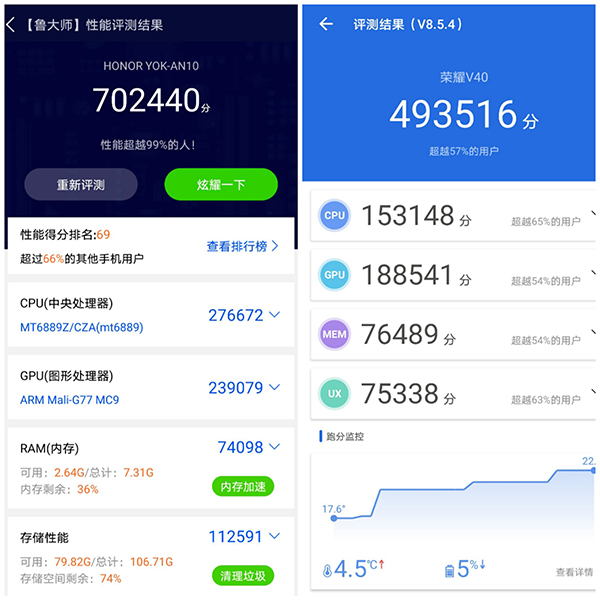 提到性能,很多人就會拿跑分軟件來衡量一下,榮耀V40安兔兔實測跑分49.3萬,魯大師跑分70.2萬,雖說談不上頂級,但對于日常使用和玩一些大型游戲還是毫無壓力的,畢竟現(xiàn)在處理器更新?lián)Q代很快,也存在著一定的性能過剩問題。