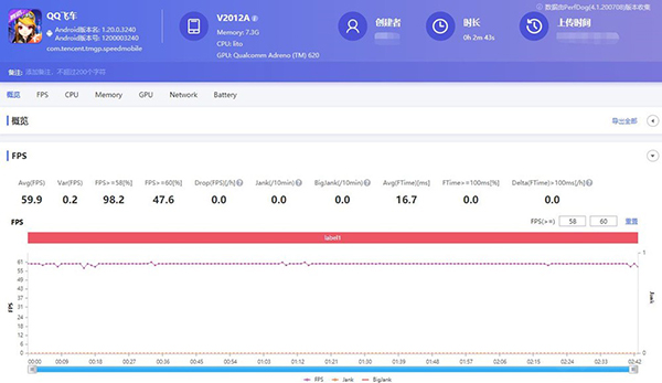 此局游戲,平均幀數(shù)59.9幀,幀數(shù)曲線近似一條直線。四字形容此局游戲體驗(yàn)——非常流暢。