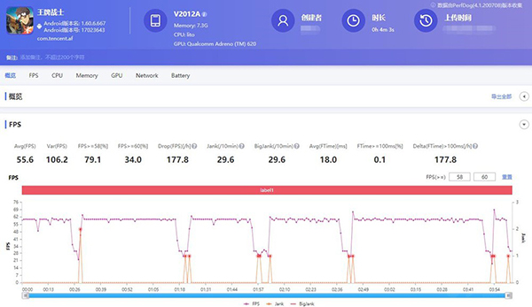 實(shí)測(cè)體驗(yàn)而言,特效炫酷,運(yùn)行流暢,不卡頓。但PerfDog的監(jiān)測(cè)結(jié)果不太友好,iQOO Z1x跑不到90幀,大部分時(shí)間都是在60幀徘徊,角色死亡到復(fù)活期間,幀數(shù)會(huì)降到30幀以下,這是系統(tǒng)的設(shè)置,復(fù)活瞬間,幀數(shù)會(huì)逼近70幀,但很快又降下來(lái)穩(wěn)定在60幀左右。因?yàn)榫唧w的游戲過(guò)程中沒(méi)有太大的波動(dòng),所以屬于均勻渲染,體感上是流暢的。