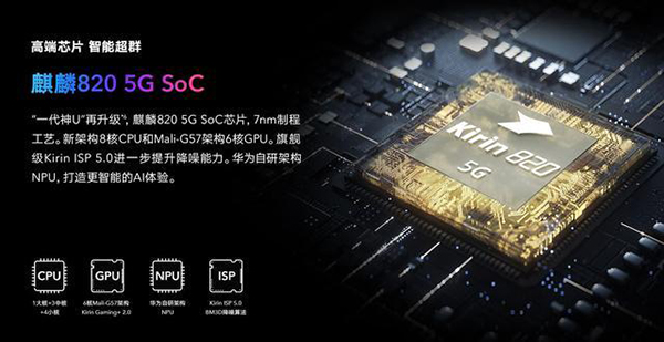 麒麟970:臺(tái)積電10nm工藝,4*A73大核心2.36Ghz+4*A531.8Ghz 雙叢集八核心CPU架構(gòu);Mail G7212核心GPU架構(gòu)850Mhz最高頻率,支持UFS2.1和LPDDR4X 1866Mhz 運(yùn)存。麒麟820:臺(tái)積電7nm工藝,1*2.36Ghz超大核心+3*2.23Ghz A76大核心+4*A551.84Ghz小核心三叢集CPU架構(gòu);GPU是Mali G576核心804Mhz。