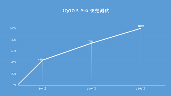 在電量耗至關機(剩余電量低于1%)的情況下,iQOO 5 Pro共計用時15分鐘充滿等效4000mAh容量的電池,5分鐘時能夠充入44%的電量,10分鐘已經(jīng)充至74%的電量,平均每分鐘能夠充入約266.67mAh電量。從充電折線圖來看,iQOO 5 Pro在前5分鐘的充電時間里速率最快,每分鐘能夠充入接近9%的電量(約352mAh);第5-15分鐘則保持了較為穩(wěn)定的充電速率,每分鐘能夠充入5.6%(224mAh)的電量。