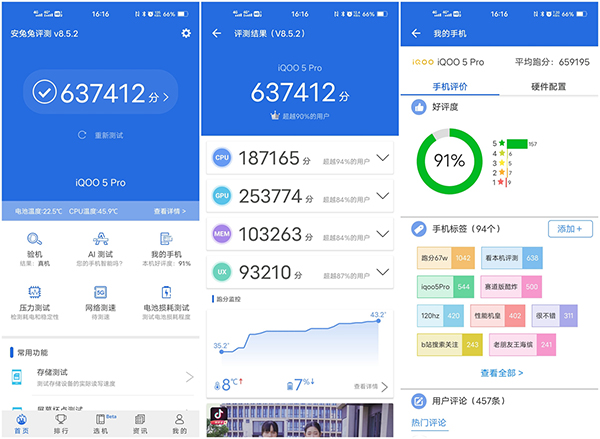 從跑分來看,iQOO 5 Pro的安兔兔跑分達(dá)到了63萬,即便是在同樣搭載驍龍865移動(dòng)平臺(tái)的機(jī)型中也是名列前茅,這無疑得益自iQOO 5 Pro在系統(tǒng)層面進(jìn)行的深入優(yōu)化。而GFXBench的成績也顯示,各項(xiàng)GPU測(cè)試結(jié)果相比上代驍龍855都有了長足的進(jìn)步,就驍龍865的性能而言足以勝任大型游戲。