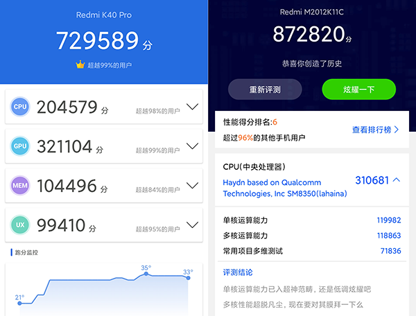 按照慣例,我們也利用安兔兔和魯大師兩款軟件做了跑分測試,實測,Redmi K40 Pro安兔兔跑分為729589分,魯大師872820分。游戲測試環(huán)境選擇了玩家基數(shù)比較大的和平精英,就結(jié)果而言,它能夠持續(xù)以接近滿幀狀態(tài)運行,雖然偶爾會有波動,但幅度并不明顯。