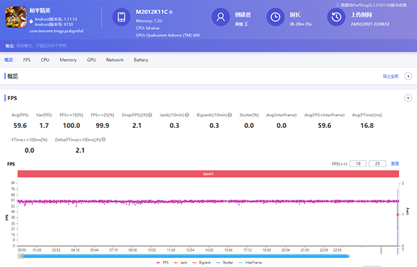 和平精英默認無法開啟90幀模式,我們在HDR高清+極限幀率模式下,一樣相當穩(wěn)定,最低幀率53,最高幀率61,平均幀率達到了59.6。29分鐘游戲過后,手機正面最高溫度37.6℃,背面最高36.8℃。