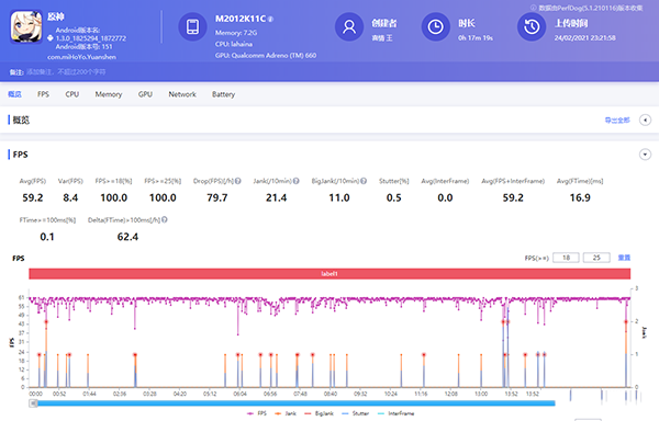 優(yōu)化極爛、比較吃手機性能的原神,在效果全開的游戲模式下,游戲17分鐘,RedmiK40 Pro基本能夠穩(wěn)定流暢的運行,偶有突然掉幀的情況,最低幀率32,平均幀率達到了59.2。游戲過后,正面最高47.6℃,背面最高50.1℃。雖然高通驍龍888在高負載下之前就已驗證有些翻車,但是對于性能的調(diào)度,RedmiK40 Pro依然還是比較激進的。
