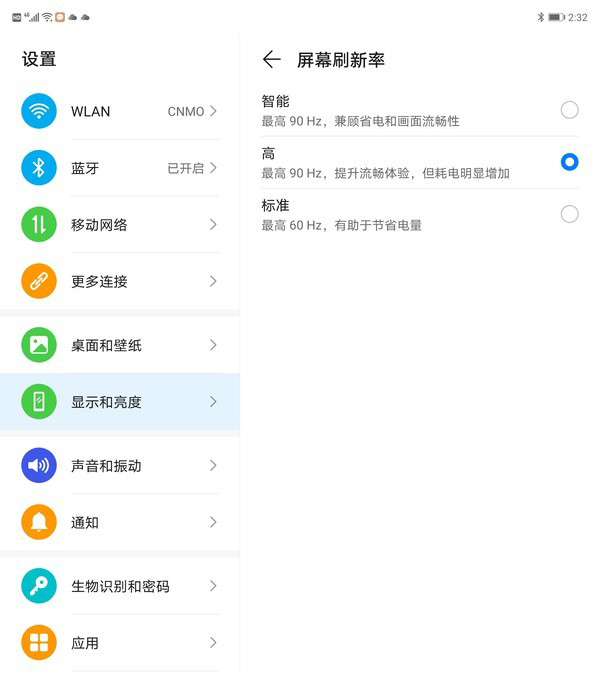 別看Mate X2有兩塊屏幕,但它的屏幕刷新率是統(tǒng)一設(shè)置的,要么全是“智能”,要么全是“高”,或者“標(biāo)準(zhǔn)”,保證了使用外屏和內(nèi)屏?xí)r體驗(yàn)的統(tǒng)一。