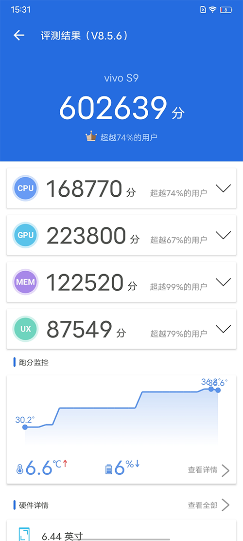 性能是這次升級的重點,vivo S9首發(fā)搭載天璣1100處理器,盡管這是一顆定位中端的SoC,但卻有著高端的性能和規(guī)格。天璣1100采用6nm工藝制造,擁有四個A78大核,同時得益于核心能力的提升,外圍功能的支持也更加完善,比如補足了此前缺少的WiFi6,閃存規(guī)格也支持到了UFS3.1,這些功能都順理成章成為了vivo S9的新標(biāo)配。我也通過安兔兔進行了跑分測試,得分超過60W,與高通最新的驍龍870平臺非常接近。
