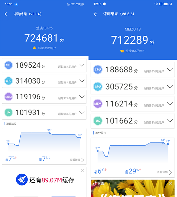 我們收到的魅族18和魅族18 Pro都是12GB+256GB版,安兔兔跑分成績在71萬和72萬左右,偶有浮動。所以,這兩款機型在日常使用中,性能方面的體驗不會有太大差距,橫向?qū)Ρ饶壳耙呀?jīng)發(fā)售的其他驍龍888平臺機型,也還算正常,并且應(yīng)該在后期優(yōu)化后還會有所增加,性能方面不用擔(dān)心。