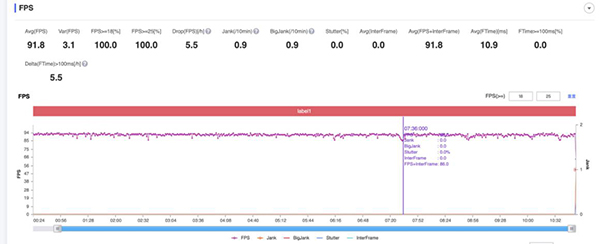 在經(jīng)過半小時預(yù)熱之后,我們通過PerfDog記錄了游戲的幀率曲線。開啟超高分辨率/幀率以及極致畫質(zhì)后進行試玩,可以看到平均幀率為91.8(如未特別說明,以魅族18 Pro作為測試機型,下同),并且?guī)是€十分平穩(wěn),在后期團戰(zhàn)階段也只有極少數(shù)的波動,就算最低幀率也在86fps以上。