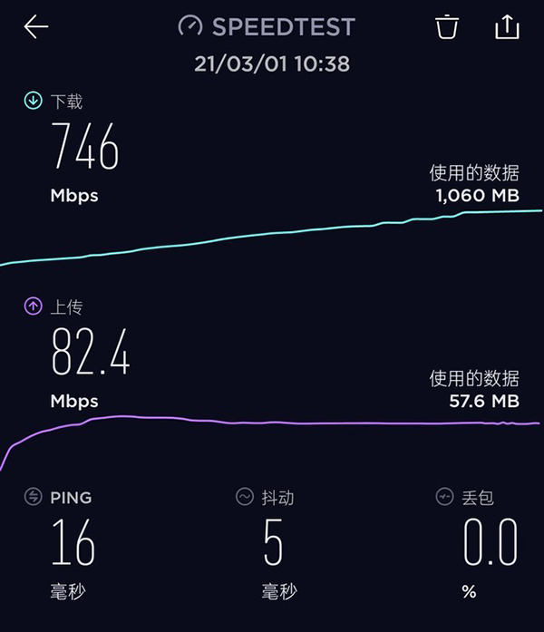 在Speedtest上,真我GT輕松跑出了746Mbps/s的下行成績,上行速率也達(dá)到了82.4Mbps/s。這個速度意味著什么呢?我們不妨看一看真我GT的實際下載表現(xiàn),在5G網(wǎng)絡(luò)下,下載一個約2G的APP,大概會用多長時間吧。
