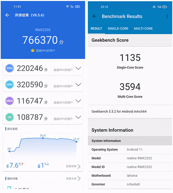 我手上這臺realme真我GT工程樣機為12GB內(nèi)存的版本,在28度的室溫下,安兔兔跑分成績?yōu)?6.6萬分(最高升溫7.6度),其中CPU成績?yōu)?2萬分,GPU為32萬分。另外,GeekBench單核1135分,多核為3594分,無論安兔兔還是GeekBench成績均是目前安卓陣營里最頂尖的水平。