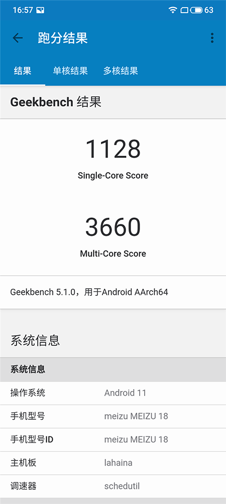由Geekbench測試可以看到,魅族18搭載的驍龍888平臺與我們此前所測試的18 Pro基本保持全然一致。另外,目前我們看到的驍龍865機(jī)型最高能夠達(dá)到單核心918、多核心3386,這也就意味著魅族18 Pro所搭載的驍龍888比之分別提高22%、5%左右。
