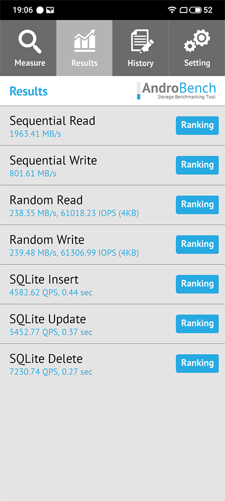 魅族18的閃存測試結(jié)果和我們之前所測試的魅族18 Pro基本一致,連續(xù)讀寫速度分別飆到了1963.41MB/s和801MB/s,相較于常規(guī)的UFS 3.0閃存,提升了至少30%左右。