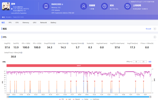 realme GT配置這么強,玩原神必須自定義全最高特效了,全程測試了17分鐘,前9分鐘的幀數(shù)波動很小,體驗非常順滑,差點忘記原神是個渣優(yōu)化游戲,在第9分鐘之后,驍龍888的熱量襲來,幀數(shù)開始波動,還好realme配備的3D鋼化液冷散熱起了作用,不再是驍龍865時代的“五秒真男人”。就算幀數(shù)有所波動,realme 真我GT在游戲中的表現(xiàn)也很流暢,第10分鐘后幀數(shù)基本上都在55幀左右,最終得到57.6FPS的平均幀。